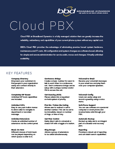 Cloud PBX at Broadband Dynamics is a fully managed solution that can greatly increase the reliability, redundancy and capabilities of your current phone system without any capital cost.